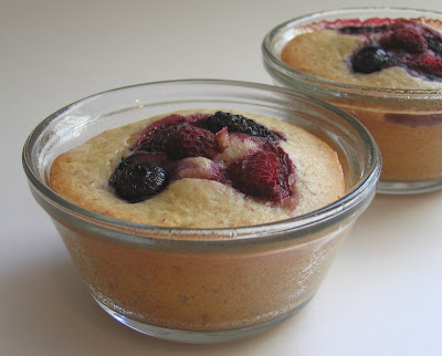 3. Divide the batter into the prepared tins, arrange the berries on top and bake for 30 to 35 minutes, until a cake tester (skewer or tip of your knife) inserted in the center comes out clean. Let stand for ten minutes, and transfer onto a rack to cool.
