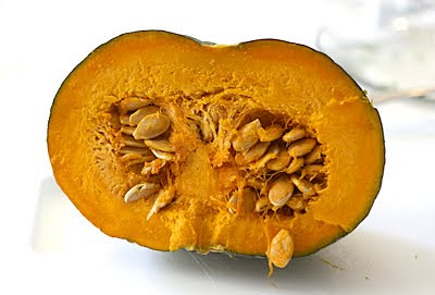Autumn is my favorite time of year. I love the crispness of the air, the scent of fires lit in fireplaces, the colors of the leaves and of the changing light, and the flavors that come with it all. One of my favorite foods that is currently in season is kabocha (“kah-bow-cha”) squash. The dark green rind hides a brilliant orangey golden flesh that is sweet and creamy when cooked. I seem to be putting kabocha into everything these days because I can get it fresh from a local farm and so have a plentiful supply of it. But it’s more than just supply–it’s because I love it. Even better is the fact that it is so good for you. Kabocha is bursting with beta carotene. It also provides vitamin C, iron, potassium, folic acid, calcium, and trace B vitamins.