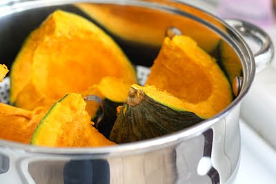 Scoop out the seeds and stringy insides. Cut the halves in half again and place the pieces rind side down in a steamer with sufficient water. Turn the heat to high and steam for about 10 minutes, or until a fork can pierce through the green rind easily.
