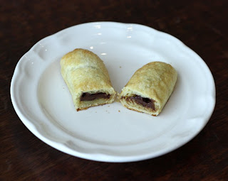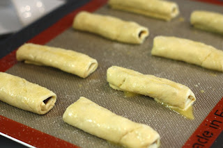 Then I rolled up the squares (starting at the end with the chocolate so that the chocolate ends up in the middle), brushed them with the remaining egg wash and sprinkled them with some coarse sugar.