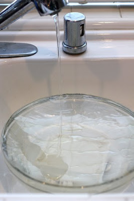 13. Place a large bowl in the sink and fill it with cold water. Remove the weight from the tofu, unfold the cloth, and gently transfer the tofu into the bowl of cold water. Gently run cold water from the tap into the bowl for 15 minutes, without letting the water hit the tofu directly.