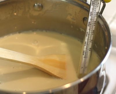 9. Quickly rinse out the cooking pot and put it back on the stove. Transfer the soy milk to the pot, and cook it over low heat, stirring continuously with a wooden spatula. When the the soy milk is between 150 to 155 degrees Fahrenheit, remove the pot from the heat.
