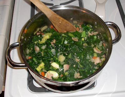 2. Add the zucchini, celery, kale, and collared greens and cook for several minutes.